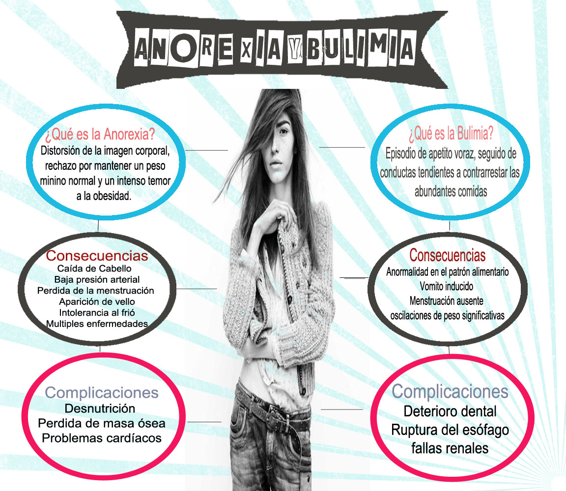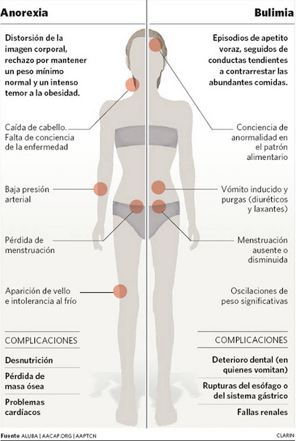 A las pocas semanas la madre me llamó y me comentó que tras haberla visto varios médicos y el psicólogo, la diagnosticaron de Anorexia. Al finalizar la conversación telefónica con la mujer me dí cuenta de que los síntomas de la Anorexia o de la Bulimia deberían conocerse de forma generalizada…no solo para hablar por la tele sobre la gran delgadez de las modelos (con lo cual estoy de acuerdo) sino para que los padres sepan identificar rasgos comunes sobre estas patologías psicológicas.